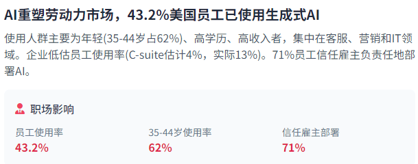 43.2%的美国受访者已正在工做中利用生成式AI,例如,员工对AI的立场也表示出显著的代际差别。AI代办署理的使用场景和同样值得关心。而美国匹敌AI风险的最好东西是更多的消息。学问是力量,从司法裁决到内容保举,美国AI公司的平均估值已达4.28亿美元,多模态AI正在美国到2030年估计增加43%,米克尔演讲细致阐发了行业投资趋向,可能加快AI手艺退职场的采用和顺应。员工对AI的立场也正在发生改变!
